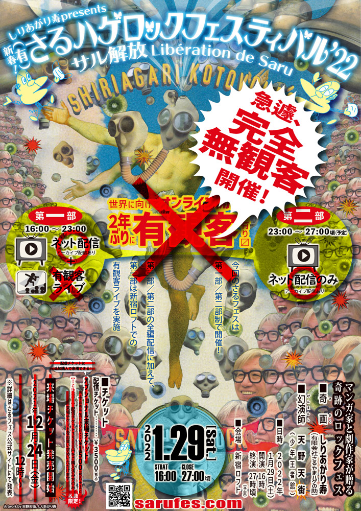 新春恒例、さるハゲロックフェスティバルは、2022年も新宿ロフトよりライブ配信にて開催。 主催しりあがり寿が掲げる今回のテーマは「サル解放 Libération de Saru」。 あらゆるものからの”カイほー”をテーマに音楽、演劇、トーク、似顔絵などなど、2ch同時配信・総計20時間でお届けする混沌の宴です。 1ヶ月間はアーカイブで何度でも視聴できますので、さるフェスを観たことがないと言う方も、この機会にお見逃しなく! 【さるハゲロックフェス‘22有観客ライブ中止/完全無観客開催のお知らせ】 新型コロナの感染拡大に伴い、有観客開催と告知していたさるハゲロックフェス‘22(1月29日)を、オンライン配信のみの完全無観客開催に変更させていただきます。 来場チケットのご購入を検討していただいていた方々、まことに申し訳ありません。新宿ロフトからのライブ配信は、予定通り開催致しますので、是非配信でお楽しみいただけますと幸いです。