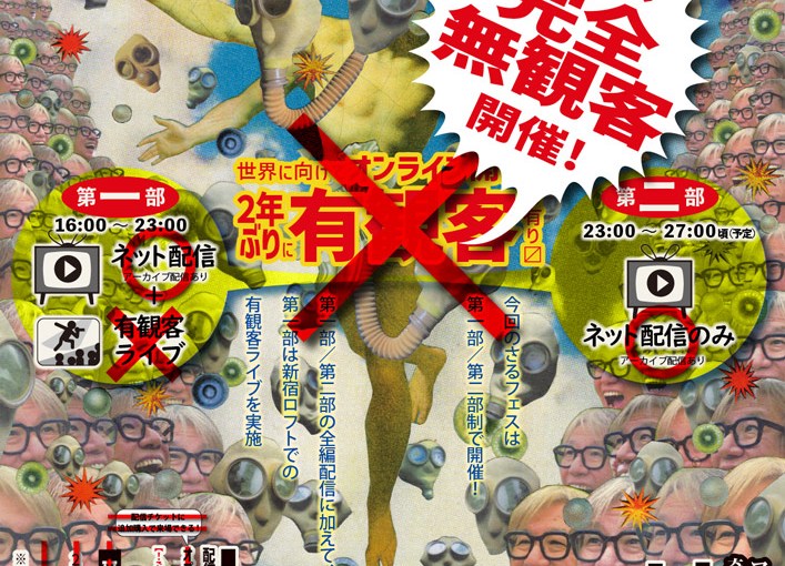 新春恒例、さるハゲロックフェスティバルは、2022年も新宿ロフトよりライブ配信にて開催。 主催しりあがり寿が掲げる今回のテーマは「サル解放 Libération de Saru」。 あらゆるものからの”カイほー”をテーマに音楽、演劇、トーク、似顔絵などなど、2ch同時配信・総計20時間でお届けする混沌の宴です。 1ヶ月間はアーカイブで何度でも視聴できますので、さるフェスを観たことがないと言う方も、この機会にお見逃しなく! 【さるハゲロックフェス‘22有観客ライブ中止/完全無観客開催のお知らせ】 新型コロナの感染拡大に伴い、有観客開催と告知していたさるハゲロックフェス‘22(1月29日)を、オンライン配信のみの完全無観客開催に変更させていただきます。 来場チケットのご購入を検討していただいていた方々、まことに申し訳ありません。新宿ロフトからのライブ配信は、予定通り開催致しますので、是非配信でお楽しみいただけますと幸いです。