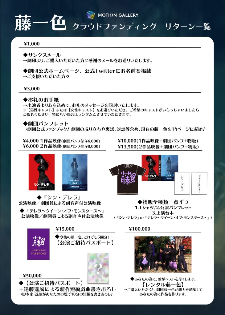 藤一色では7月公演を実施するにあたり、MotionGalleryにて【公演応援プロジェクト】を立ち上げさせていただきました。